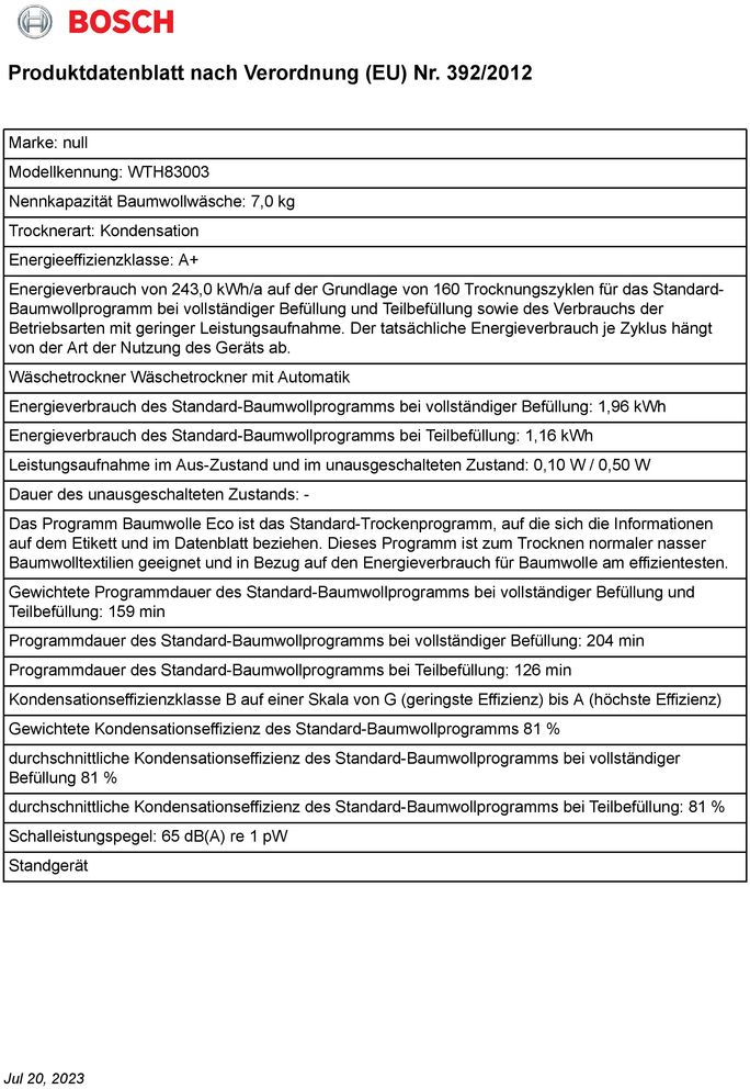 - Energieverbrauch des Standard-Baumwollprogramms bei vollständiger Befüllung: 1.96 kWh