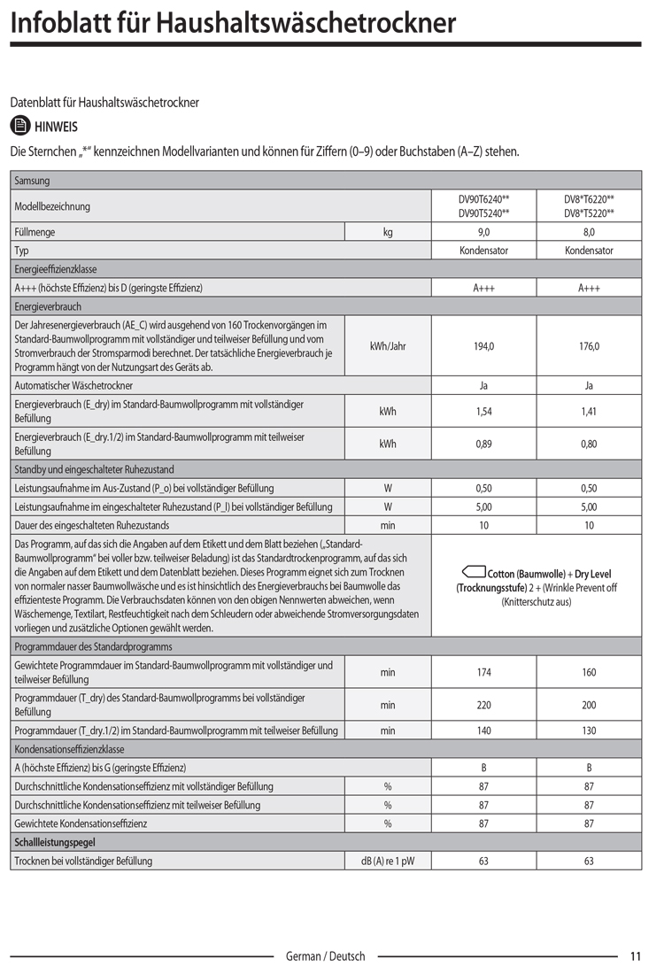 - Die Informationen auf dem Etikett und dem Datenblatt beziehen sich auf folgende Programme3) Baumwolle + Trockengrad 2, (Knitterschutz ausgeschaltet)