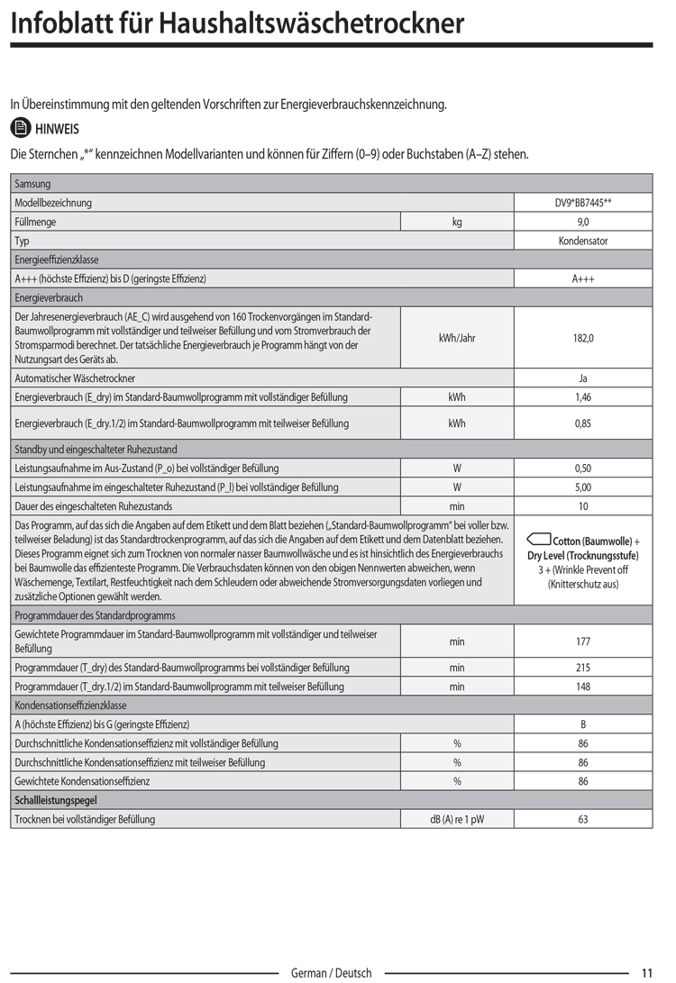 - Energieverbrauch (E_dry.1/2) im Standard-Baumwollprogramm mit teilweiser Befüllung 0.85 kWh