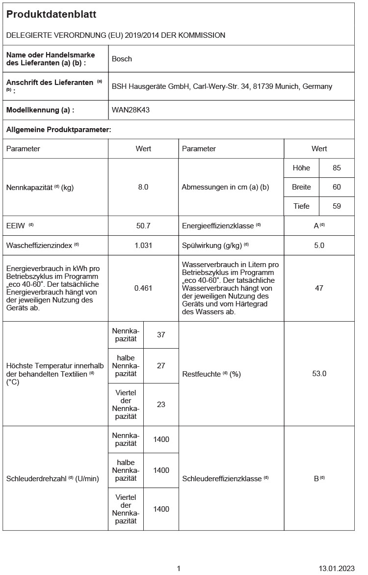 - Gewichteter Energieverbrauch in kWh pro 100 Waschzyklen im Programm eco 40-60: 46 kWh