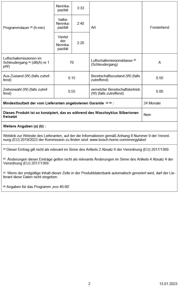 - Stromverbrauch² / Wasserverbrauch³: 46 kWh / 47 Liter