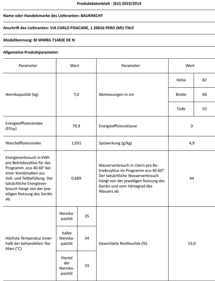 - Luftschallemissionen Waschen/Schleudern: 46/72 dB(A) re 1pW, Luftschallemissionsklasse A