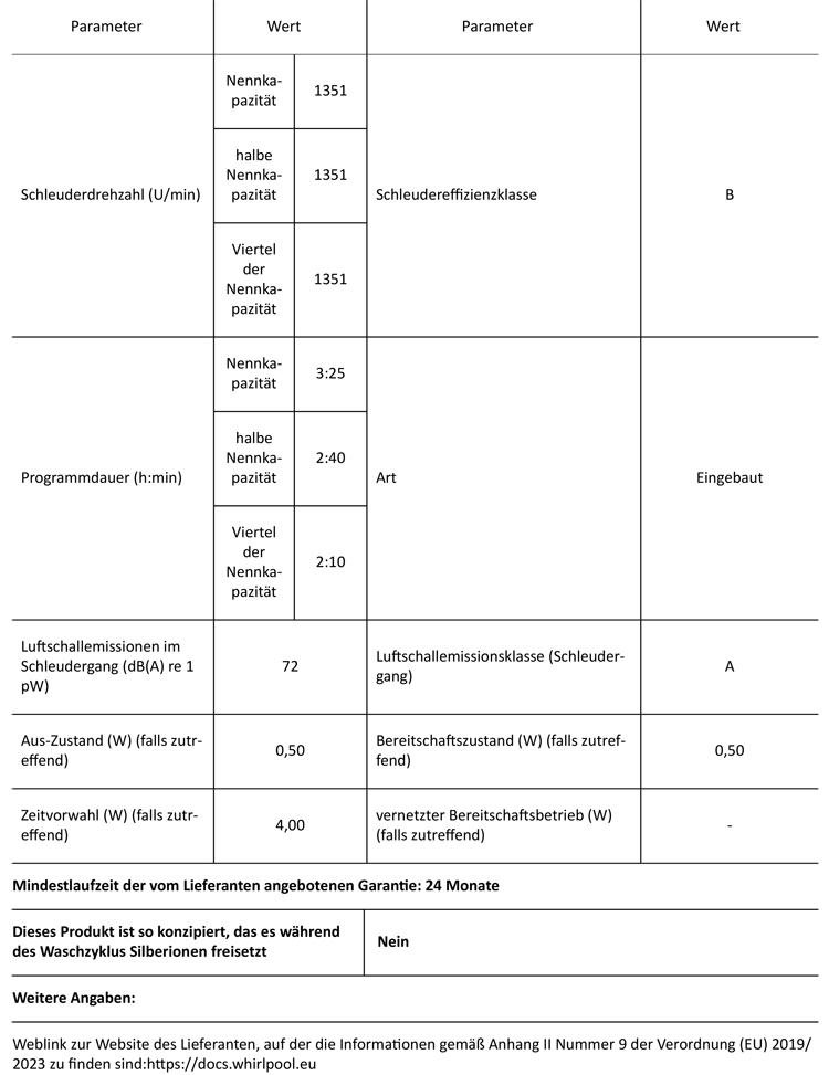 - Schleuderdrehzahlen: 1351 UpM variabel einstellbar oder ohne Endschleudern
