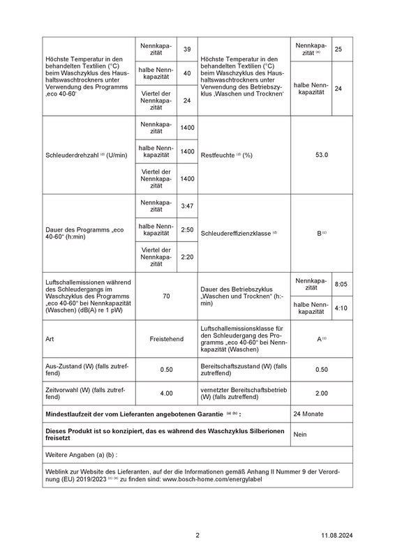 - Dauer im Wasch- und Trocken-Betrieb in Stunden und Minuten bei Nennkapazität: 8:05 h