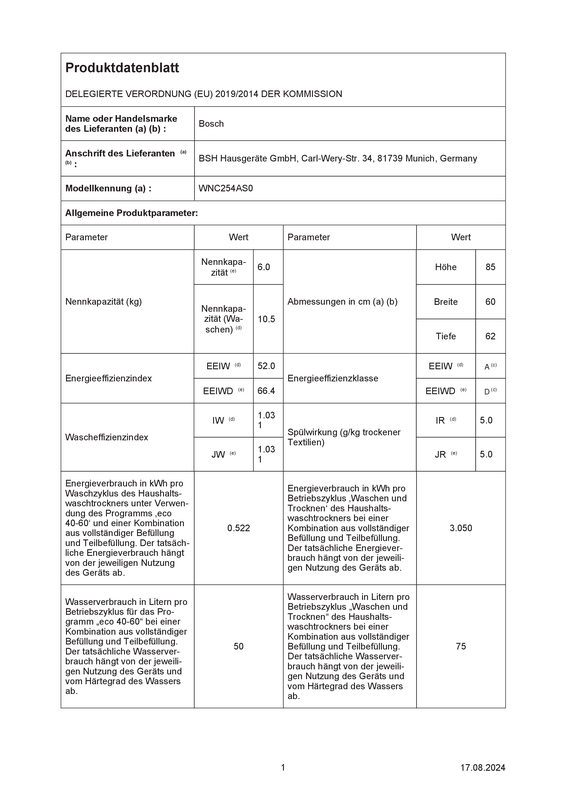 - Energieeffizienzklasse im Wasch- und Trocken-Betrieb: D