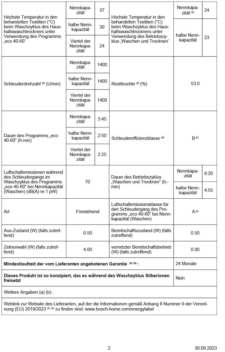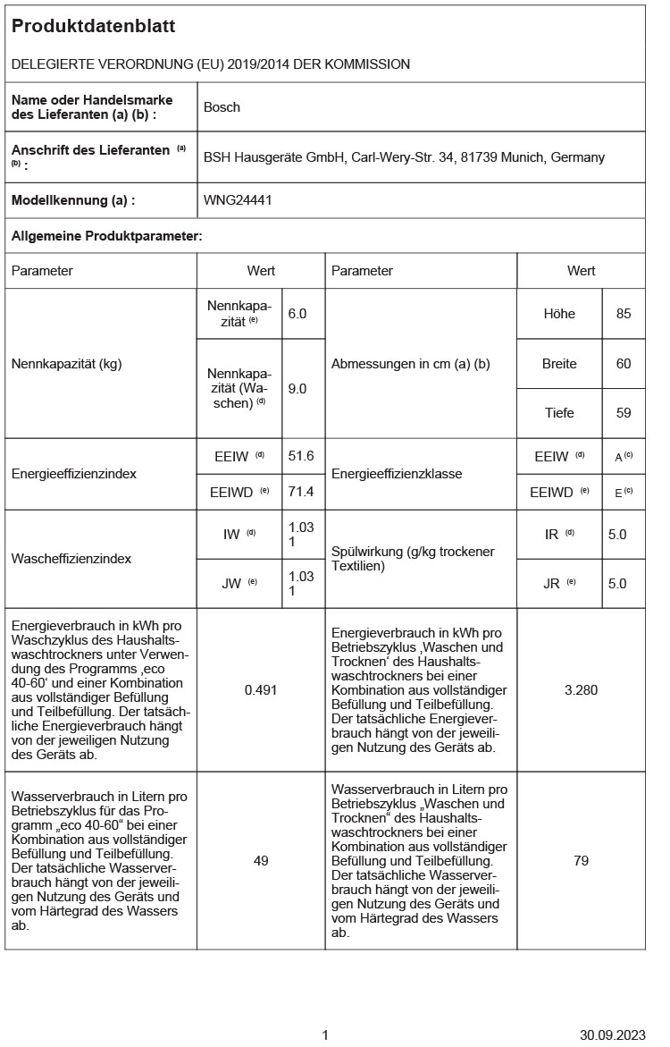 - Energieeffizienzklasse im Wasch- und Trocken-Betrieb: E