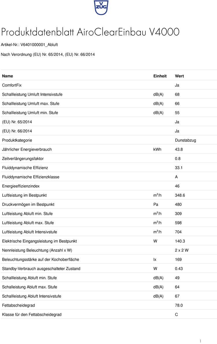 - Schalleistung Abluft max. Stufe: 64 dB(A)